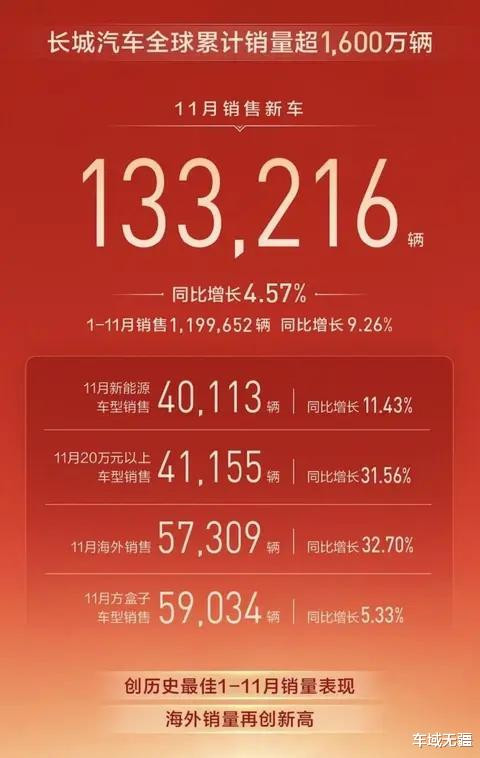 一汽集团前11个月累计销量为299.5万辆,目标完成度为86.81%。红旗品牌累计销量突破42万辆,同比增长9.2%。